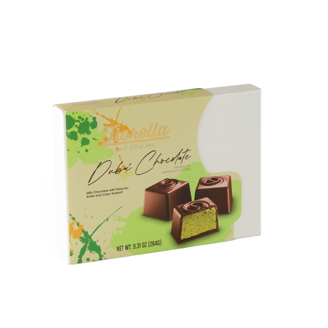 This is a gift box containing Fiorella brand Dubai chocolate. The product is made with buttery crispy kadayıf (shredded phyllo dough) and filled with pistachios.
