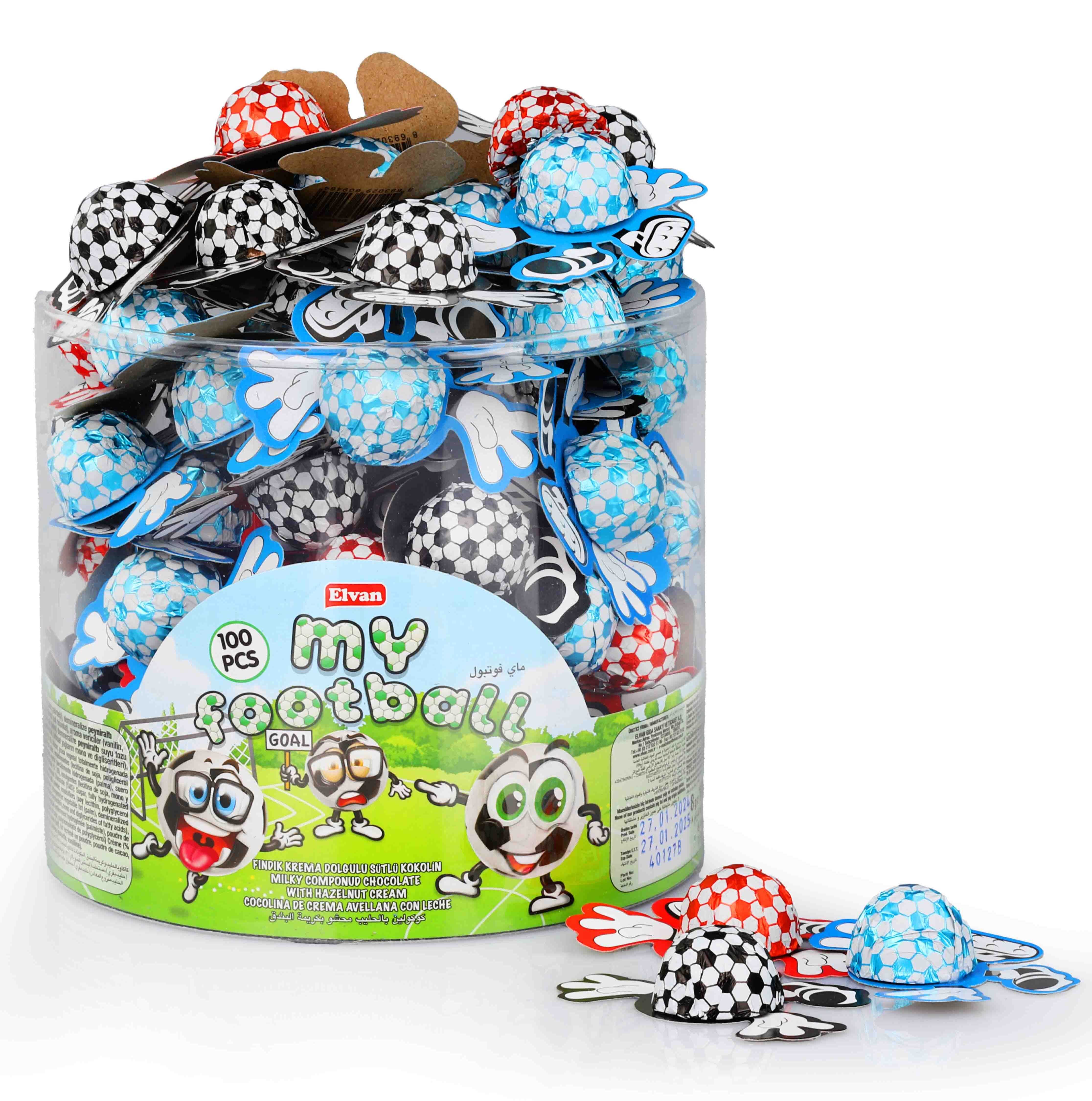 It is a hazelnut cream filled milk product of Elvan brand. There are 100 football ball visual products in a box.
