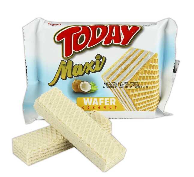 Today markasının hindistan cevizi kremalı gofret ürünüdür. Gofret yaprakları arasında hindistan cevizi kreması yer almaktadır. Today Maxi Hindistan Cevizi Kremalı Gofret üzerinde kaplama bulunmamaktadır.
