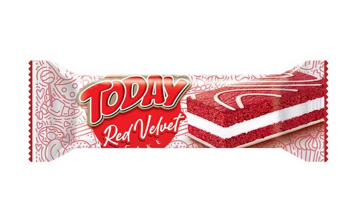 It is a milky cream covered and decorated red velvet cake product of the Today brand. There is milk cream between the red velvet cake.